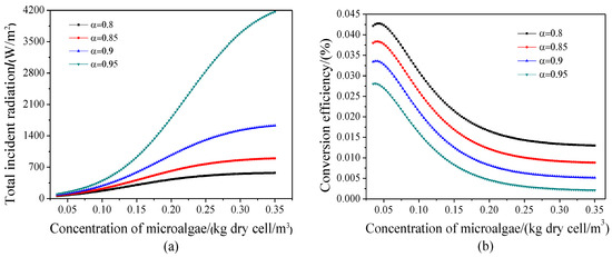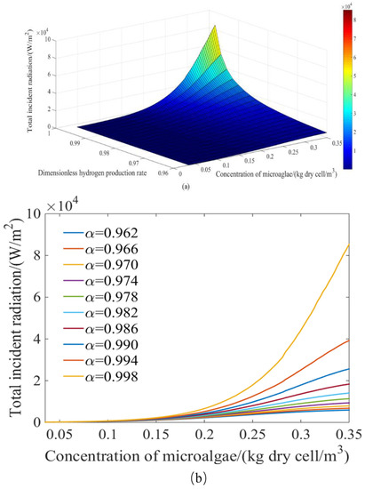 Variable light intensity PBR systems have great potential to improve performance and save energy. It is of great significance to study the relationship between the concentration of microalgae, the light intensity, and the performance of PBR. Figure 7 shows the curves for total incident radiation and the total hydrogen production rate varying with the concentration of microalgae at α = 1. With the increase in microalgae concentration, the corresponding light intensity and hydrogen production rate were enhanced. In addition, with the increase in microalgae concentration, the growth rate of light intensity increased, and the growth rate of hydrogen production rate decreased. According to Figure 7, the higher the concentration of microalgae and the total incident radiation are, the larger the hydrogen production thrust coefficient and the slope of the hydrogen production thrust coefficient curve. When α = 1, the hydrogen production thrust coefficient was 0. Therefore, the higher the concentration of microalgae, the larger the light intensity, the more difficult it is to drop the hydrogen production thrust coefficient to 0. As a result, the explosive growth occurred with higher concentrations of microalgae. Moreover, with the increase in light intensity, the hydrogen production thrust coefficient decreased constantly due to the photo-inhibition effect. As a result, the increase of hydrogen production rate became smaller and smaller. Figure 8a,b shows that when the concentration of microalgae was constant, conversion efficiency of light energy to hydrogen energy was improved and the light intensity of LED decreased with the decreasing α. Therefore, when the requirements of total photosynthetic effective hydrogen production rate and conversion efficiency of light energy to hydrogen energy are determined, the relationship between the intensity of LED light and the concentration of microalgae can be determined in the process of PBR operation.