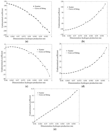 In engineering applications, the accurate quantitative relationship between performance parameters and working conditions is obviously more convenient in operation, performance optimization and forecasting of a PBR system. Therefore, the relational expressions were obtained with the fitting performance surface or curve in this section. Figure A4 in Appendix A shows the relative error between the curve of total hydrogen production rate varying with microalgae concentration at α = 1 and the fitting curve obtained by the IQPSO curve fitting method. It can be seen that the maximum relative error did not exceed 2%. The fitting relational expression is as follows:
