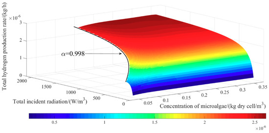 where is shown in Appendix A in Table A3. As shown in Appendix A in Figure A6, the maximum of the relative error matrix is 4%, which means that if the concentration of microalgae and hydrogen production rate is in that region mentioned above, there will be a relatively larger error between the numerical results and the fitting surface. However, the result was still acceptable, and it can be used to guide operation of the PBR system. According to the definition of conversion efficiency of light energy to hydrogen energy , the relational expressions of , α and X are as follow: