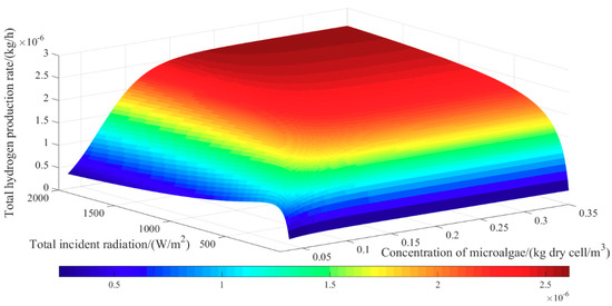 The performance surface of total incident radiation with the dimensionless hydrogen production rate (0.1–0.96) and the microalgae concentration.