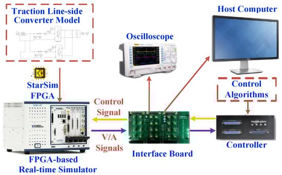 FPGA-RTDS and the control algorithm is designed in MATLAB Simulink and downloaded into NI PXle-1082 RTDC using modeling tech StarSim software. StarSim is a LabVIEW-based electromagnetic transient simulation software, mainly for verifying control algorithms and system models. The StarSim express load and convert the StarSim model file into an executable simulation code. The StarSim simulator can download the system model to FPGA without any FPGA programming. The NI PXle-1082 houses the modeling teach RCP controller. The TPS circuit model runs on the FPGA-based real-time simulator, while the control algorithm model runs on the modeling tech RCP controller, thereby forming a closed-loop. The line current, DC-link voltage, and line voltage signals are observed on the oscilloscope and monitor.