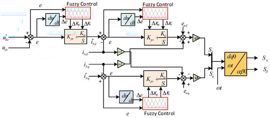 The proposed method is the modification of traditional current decoupling control, as shown in Figure 3. The input in the fuzzy PI control is the error e and error change rate Δe. The two clear values are first blurred, and then the correction ΔKp and ΔKi are inferred by the fuzzy control rule. Finally, defuzzification (clarity) is performed to obtain the value of ΔKp and ΔKi.