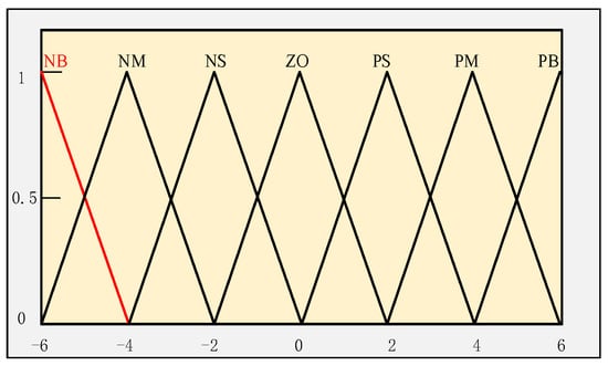 where µ and x are the membership function and the degree of the association in the set of numbers A, respectively. Though any convex shape can be selected for MF, Gaussian, triangular, and trapezoidal functions are turn out to be more suitable with fuzzy logic theoretic and designers than higher-order based functions such as quadratic, or cubic []. In this paper, the triangular shape is selected, and the levels chosen for the chosen membership function were, Positive big (PB), Negative big (NB), Positive medium (PM), Negative medium (NM), Positive small (PS), Negative small (NS), and Zero (ZO), as shown in Figure 4 [].