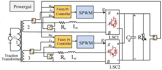 Figure 2 shows the main circuit topology of the TPS. Each CRH5 EMU consists of five traction power units. Each traction power unit consists of a dual single-phase TLSC with the same topology, circuit parameters, and control strategy. Considering the VLFO, the EMUs are in the power-up phase of the lift, the inverter and the electric locomotives are in an ideal state, and the impact is negligible. Therefore, it is equivalent to the load resistance. Finally, the equivalent circuit is obtained, as shown in Figure 2, where Lo and Ro are the leakage inductance and resistance. Combination of four insulated gate bipolar transistors (IGBTs) with the following symbols (, , , and ) were adopted in building the converter circuit. Cd provides the DC-link capacitance, which plays the role of exchanging reactive power with the leakage inductance of the transformer and replace the car with a purely resistive load Rload.