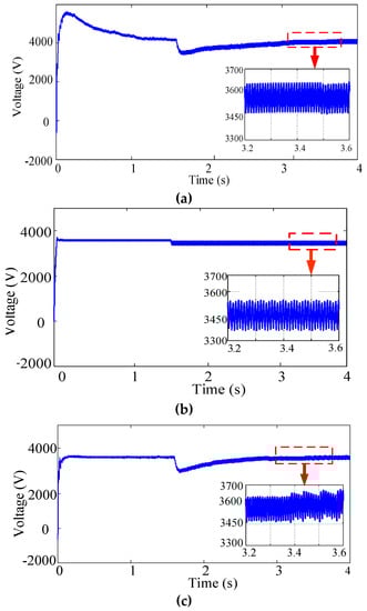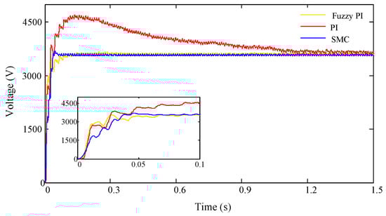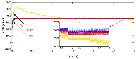 At this juncture, it’s essential to check the load performance evaluation of the proposed controller. Therefore, a step-changing test is performed. The TLSC equivalent resistant load was initially set at 25 Ω and abruptly changed to 10 Ω at 1.6 s. When the load was kept constant at 25 Ω, both control methods were stable, but when the load suddenly changes at 1.6 s, it was observed that the three control methods experience a voltage drop. The FPI control returns to the reference voltage of 3600 V after 1.8 s, but PI control cannot return to stability after the spike, although the voltage drop of the SMC is small, it can also not be restored to the reference value after the spike, as shown in Figure 11.