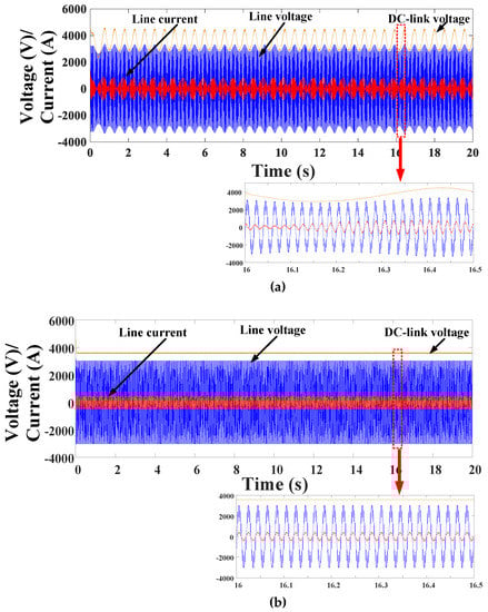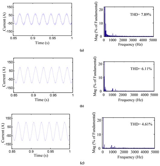 Figure 7 shows the simulation waveforms of DC-link voltage based on the proposed FPI and the other two controllers. The performance indexes of the DC-link voltages are listed in Table 3. The waveforms of line current and total harmonic distortion (THD) based on the three controllers are as shown in Figure 8. The grid side current and voltage waveforms are as shown in Figure 9.
