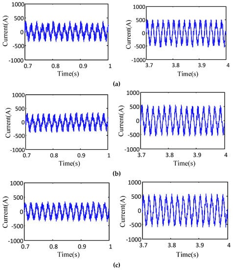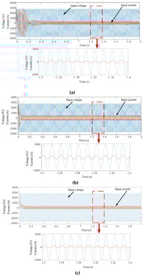The PI controller input current decreases at 0.2 s, and increases again at about 0.2 6 s, before finally settling at 0.38 s, as shown in Figure 9a. The input current and voltage of the three control methods simulated are almost constantly in phase as shown in Figure 9. It was observed that the initial grid current distortion of the FPI controller is negligibly small than the other two methods. Therefore, using the FPI controller in EMUs operation can significantly reduce the input current impact, thereby reducing the damage to equipment. The adjustment time of the FPI controller is also the shortest among the three control methods. The grid current of the two nonlinear controllers is almost invariably in a stable state as shown in Figure 9b,c. From the above results and analysis we can conclude that the response speed of the system was fantastically improved by the proposed FPI control method, the static and dynamic characteristics of the TLSC was also improved, and the overshoot is significantly reduced to the barest minimum. Hence the proposed FPI controller has better characteristics than SMC and PI controllers.