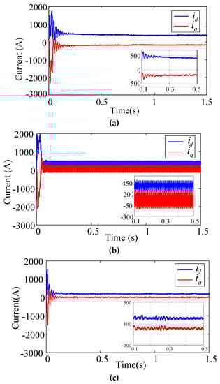 Waveforms of id and iq when the load change suddenly: (a) PI (b) SMC (c) FPI.
