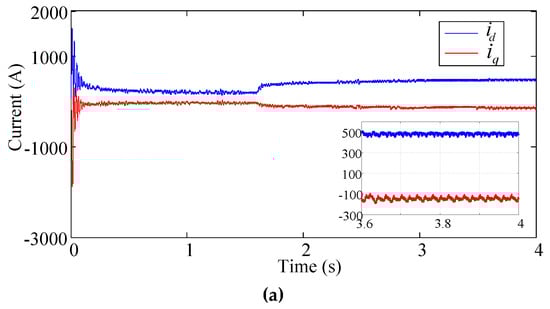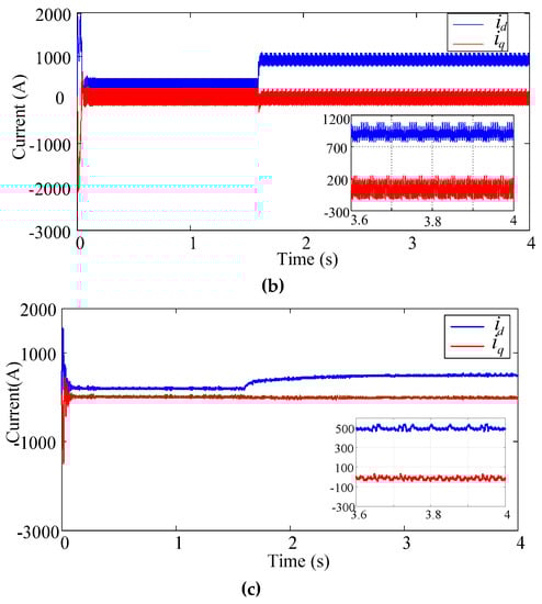 The waveform of d-axis current under PI control rises, and after that stabilizes at 500 A. The q-axis current of FPI control remains stable at 0 A, whereas the q-axis current of PI control and SMC cannot return to 0 A after undergoing load change. Therefore, the power factor cannot reach 1. The FPI controlled d-axis current waveform rises and reached a stable value at a faster speed. In summary, the FPI control can ensure excellent dynamic and static performance. When the load change suddenly, the regular operation of the system can still be guaranteed, and the reference value can be well tracked.