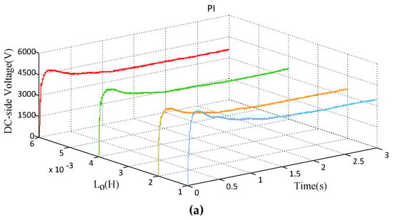 We choose grid inductance as a parameter and check its impact on the stability of the VGCS. When the grid inductance Lo varies from 6 × 10−3 to 1 × 10−3 H, the two nonlinear controllers maintained relative stability, as shown in Figure 14b,c, their dynamic performance is unaffected by the change in Lo. On the other hand, the PI controller cannot maintain stability with the increase of Lo as shown in Figure 14a.