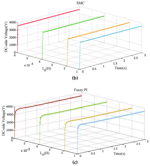 - A parameter sensitivity test of grid inductance shows that both the proposed FPI and SMC control can track the reference value of the DC-link voltage when the grid inductance varied. While PI, on the other hand, cannot track the reference value of the DC-link voltage under the same condition, this shows the superiority of the proposed FPI controller to the system’s external disturbance.