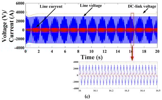 From Figure 20a, it can be observed that when the value of the grid inductance is very high, both the voltage and current waveforms exhibit oscillations, and the system cannot maintain stability. A similar test was conducted on the proposed FPI controller and SMC under the same condition, and the two nonlinear controllers effectively suppressed it, as shown in Figure 20a,b. Although the DC voltage of the SMC stabilizes faster than that of FPI, the line current and the DC voltage fluctuations of the proposed controller are the shortest, which validates the superiority of the proposed FPI control on VLFO suppression.
