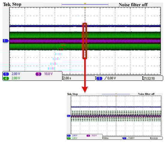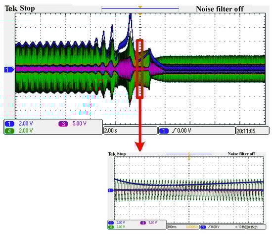 To further check the suppression effect of the proposed control method on VLFO, a worst-case scenario test was conducted. VLFO usually occurs when the grid inductance Lo is very high, to accord with the practical situation, a VLFO was induced by increasing Lo to the highest maximum value, and the three control methods were put on a test to suppress it. The current and voltage waveforms of the three controllers are as shown in Figure 20.
