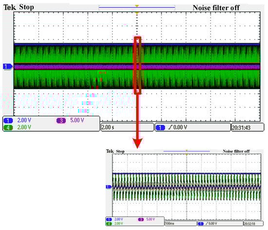 Comparing Figure 22, Figure 23 and Figure 24, one can conclude that when LSC of EMUs is controlled under the proposed FPI control, better quality current with lower fluctuation and THD are generated, and the VLFO was also effectively suppressed. Figure 22 shows that unstable LFO occurred when PI control was put on test on the HIL platform, and when the value of the DC-link voltage is very high, the system collapsed completely. At this point, the DC-link voltage dropped to 0 V. Figure 23 and Figure 24, demonstrated the VLFO suppression effect of the two nonlinear controllers; although the voltage amplitude of SMC is slightly higher than that of FPI, it also maintained stability. Among all three controllers, only FPI tracked the voltage and current waveforms in a near-absolute manner. These improvements were achieved under the condition that the proposed FPI controller is good enough to track a small deviation of the measured parameters from the set-point and automatically takes drastic action. These results validated the suppression effect of FPI control on the VLFO phenomenon and confirmed the superiority of the proposed FPI control scheme.
