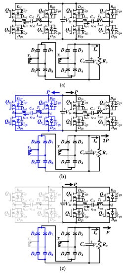 Modern power converters with high efficiency and high power density are important to achieve compact size and low power loss. To achieve the low switching loss and compact size, the soft switching circuit topologies with the high switching frequency using wide-band gap power devices, such as GaN power devices, have been developed in modern power electronics. The GaN devices have low switching loss characteristic at high switching frequency, so that the converter efficiency is increased. The main drawback of GaN power devices is high cost compared to power MOSFETs. For the past twenty years, the quasi-resonant (QR) flyback converter [1,2] with low turn-on switching loss, the active clamp dc/dc converters [3] with zero voltage switching operation, the resonant converters [4,5,6] with soft switching operation on power semiconductors, and pulse width modulation (PWM) converters [7,8,9] have been developed to implement high efficiency converters with power MOSFETs devices. QR flyback [1,2] is limited at low power applications, and active clamp dc/dc converters [3] have the problems of dc magnetizing current and unbalance voltage and current stresses on the rectifier diodes. For conventional resonant converters [4,5,6], the input voltage variation is limited due to the limited available voltage gain on the resonant tank. Conventional phase-shift PWM full bridge converters [7,8,9] have drawbacks of hard switching loss at light or low load condition, and high freewheeling current at low load or high input voltage condition. For solar photovoltaic systems, the output voltage of a solar panel is relative to geographical location and solar intensity, so that the solar cell panel has wide output voltage range. Therefore, the power converters with wide voltage operation and high circuit efficiency are demanded for solar power systems. The dc/dc converters with the widespread voltage operation have been proposed in [10,11,12,13,14,15] for fuel cell and solar power converters. In [10,11], the series-connected or parallel-connected structure has been studied to achieve wide input voltage operation on fuel cell power conversion. In [12,13,14,15], the phase-shift PWM dc/dc power converters have been presented to achieve wide voltage operation. In [16], the full-bridge resonant converter with one ac switch and two transformers is proposed to achieve wide input voltage operation. The main drawbacks in [16] are (1) transformer will be shorted suddenly when ac switch is turned on, which will result in serious problems at the transient voltage change and make system unstable, (2) the control scheme of this circuit topology is much more complicated with four equivalent operation topologies, and (3) some power switches will always be conducting at some specific circuit topologies that will increase the conduction loss.