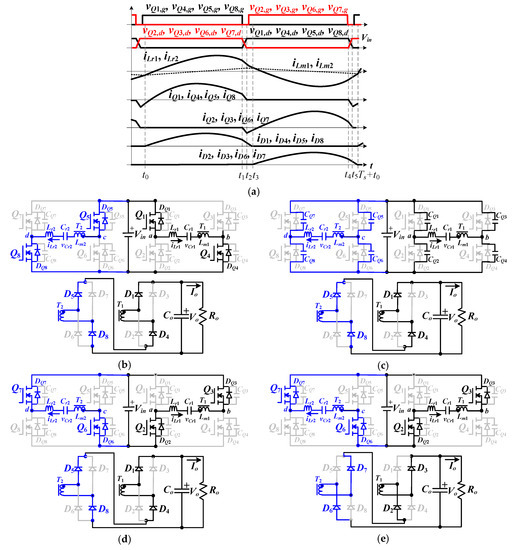 Step 1 [t0 ~ t1]:vCQ1 = vCQ4 = vCQ5 = vCQ8 = 0 at time t0. Owing to iLr1(t0) and iLr2(t0) are negative, diodes DQ1, DQ4, DQ5, and DQ8 are conducting. Q1, Q4, Q5, and Q8 can turn on after t0 with soft switching operation. In step 1, vab = vcd = Vin and vLm1 = vLm2 = nVo. Cr1 and Lr1 are naturally resonant in the first resonant tank, and Cr2 and Lr2 are naturally resonant in the second resonant tank.