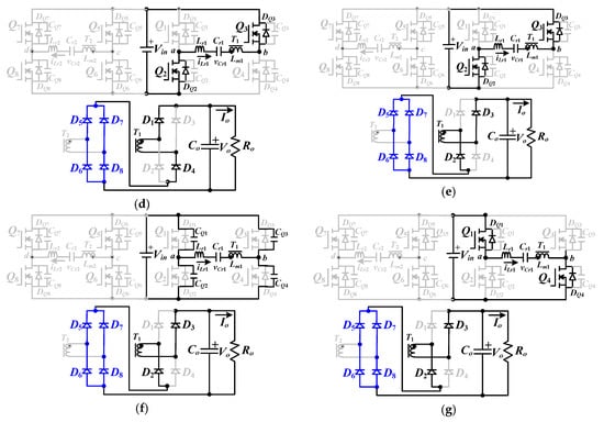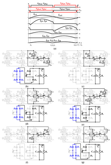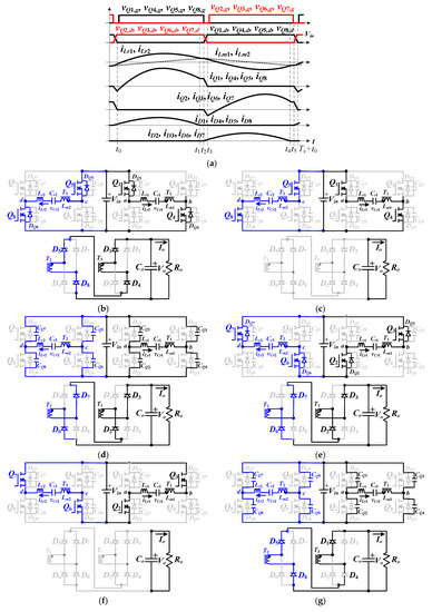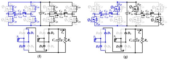 The PWM waveforms under fs < fr condition are given in Figure 5a and the equivalent circuits in every cycle under high voltage input range are provided in Figure 5b–g. The operation principles under high voltage input and fs < fr condition are discussed as follows.