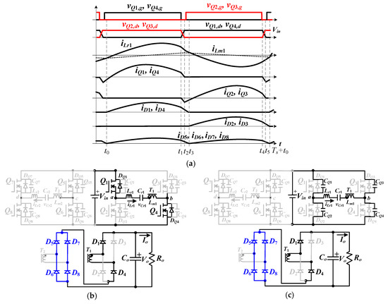 For low voltage input range, two resonant circuits with parallel-series connection are operated to achieve the higher voltage gain. The dc voltage gain of each resonant converter is controlled between 1 and 2. Since two rectified voltages on the secondary-side are series-connected, the resultant voltage gain of the proposed parallel-series connected resonant converter is regulated between 2 and 4 under 100 V < Vin < 200 V. The proposed converter has six operating steps in every switching cycle. Under the condition of fs (switching frequency) > fr (resonant frequency), the main PWM waveforms are demonstrated in Figure 2a. The equivalent circuits of six operating steps are provided in Figure 2b–g.