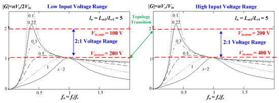 where is the quality factor, ln = Lm1/Lr1 is the inductor ratio, and fn = fs/fr is the frequency ratio. The output voltage can be obtained in (9).