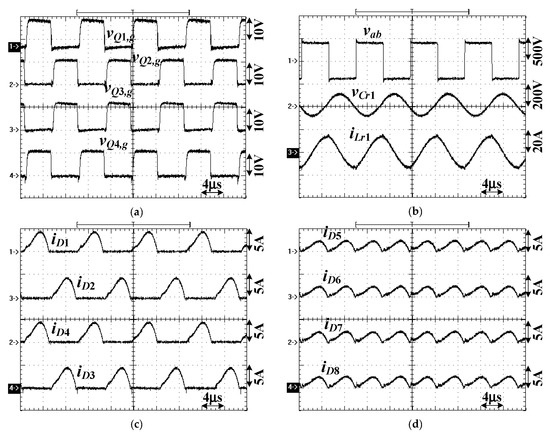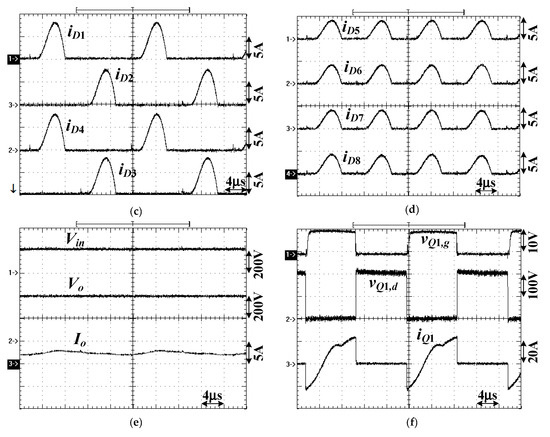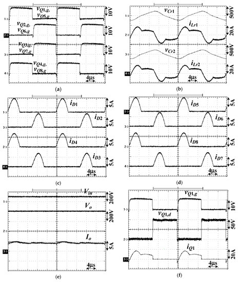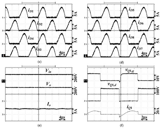 Experimental results at Vin = 400 V (high voltage range) and 1 kW load. (a) vQ1,g ~ vQ4,g, (b) vab, vCr1, iLr1, (c) iD1 ~ iD4, (d) iD5 ~ iD8, (e) Vin, Vo, Io, (f) vQ1,g, vQ1,d, iQ1.