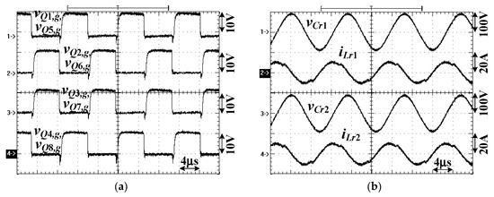 In the prototype circuit, the actual resonant components are Lr1 = Lr2 = 40 μH, Lm1 = Lm2 = 200 μH and Cr1 = Cr2 = 63 nF. The voltage stress of Q1 ~ Q8 equals Vin,max = 400 V and power MOSFETs STW48N60M2 with 600 V/26 A rating are used for Q1 ~ Q8. The voltage stress of D1 ~ D8 equals Vo = 400 V and STTH8R06FP with 600 V/8 A are used for D1 ~ D8. The selected output capacitance Co = 810 μF (three 270 μF in parallel).