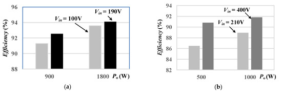 Experiments based on a prototype circuit shown in Figure 7 are demonstrated to confirm the circuit performance. The test results at low input voltage range are shown in Figure 8 and Figure 9 with Vin = 100 V and 190 V, respectively. For low voltage range, two resonant circuits are operated with parallel-input and series-output structure to achieve high voltage gain. Figure 8 are the test waveforms under Vin = 100 V, Vo = 400 V and Po = 1.8 kW. Figure 8a provides the measured waveforms of vQ1,g ~ vQ8,g. The test switching frequency at Vin = 100 V shown in Figure 8a is about 51 kHz. Figure 8b gives the experimental waveforms of the resonant currents and voltages. Due to fs (51 kHz) < fr (100 kHz), the resonant currents iLr1 and iLr2 are quasi-sinusoidal waveforms. Figure 8c,d provide the current waveforms of the rectifier diodes. Owing to fs < fr, the rectifier diodes D1 ~ D8 are all reverse biased without reverse recovery current loss. Figure 8e demonstrates the experimental waveforms under Vin = 100 V, Vo = 400 V and Io = 4.5 A (Po = 1.8 kW). Figure 8f demonstrates the experimental waveforms of power switch Q1 at full load. Before Q1 turns on, the drain voltage vQ1,d is already zero voltage. Therefore, the zero voltage turn-on of Q1 is achieved. Q2 ~ Q8 have the same turn-on characteristic as Q1 with soft switching operation. Figure 9 provides the test waveform under Vin = 190 V, Vo = 400 V and Po = 1.8 kW. The switch signals of Q1 ~ Q8 are provided in Figure 9a. The measured resonant current and voltages are given in Figure 9b. Since fs ≈ fr, the resonant currents are sinusoidal waveforms. The measured diode currents are provided in Figure 9c,d. The measured waveforms of input voltage Vin = 190 V, load voltage Vo = 400 V and load current Io = 4.5 A are provided in Figure 9e. The test waveforms of switch Q1 are given in Figure 9f. For high input voltage range, Figure 10 and Figure 11 shows the experimental results of the studied circuit at Vin = 210 V and 400 V, respectively. For high input voltage range, only one resonant converter (Q1 ~ Q4) is controlled to regulate load voltage. The rectifier diodes D5 ~ D8 are bypassed at high voltage range operation. The measured waveforms at Vin = 210 V, Vo = 400 V and Po = 1 kW are provided in Figure 10. Due to the voltage gain at Vin = 210 V is close to 2 (under high input voltage range), it is obtained that fs < fr. From Figure 10b, the resonant current iLr1 is a quais-sinusoidal waveform. From Figure 10c,d, D1 ~ D8 turn off under zero current switching. Since the diodes D5 ~ D8 are bypassed for high input voltage range, the secondary-side rectified current is distributed on D5 ~ D8. Therefore, the diode currents iD5 ~ iD8 are balanced and the amplitude of iD5 ~ iD8 is only one-half of amplitude of iD1 ~ iD4. From test results in Figure 10f, it can observe that the soft switching turn-on of Q1 is achieved. Figure 11 provides the test waveforms under Vin = 400 V, Vo = 400 V and Po = 1 kW. The voltage gain at Vin = 400 V is 1 (Figure 6). The resonant current iLr1 is a sinusoidal waveform (Figure 11b). Similarly, the secondary-side rectified current is distributed on D5 ~ D8 and the amplitude of iD5 ~ iD8 (Figure 11d) is equal to one-half of amplitude of iD1 ~ iD4 (Figure 11c). From the experimental waveforms in Figure 11f, Q1 is turned on at zero voltage switching. The measured circuit efficiencies of the proposed converter are 92.55% at Vin = 100 V and Po = 1.8 kW, 94.1% at Vin = 190 V and Po = 1.8 kW, 90.8% at Vin = 210 V and Po = 1 kW, and 91.8% at Vin = 400 V and Po = 1 kW. It is clear that the proposed converter has better circuit efficiency at low input voltage case. Because the magnetizing current loss is depended on the output voltage instead of input voltage. For high voltage input, only one resonant converter is operated to provide 1 kW output. However, 1.8 kW is provided by two resonant converters at low voltage input case. Therefore, the proposed converter has better circuit efficiency at low input voltage case. Figure 12 provides the test circuit efficiencies of the proposed resonant converter for 50% and 100% rated power under different input voltages.