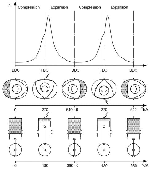 Figure 2 shows that the conventional engine completes two-stroke cycles in one crank shaft revolution (360 °CA). In the two-stroke Wankel rotary engine, at each rotor revolution, every three sides of the rotor complete two total cycles (two stroke), i.e., two two-stroke cycles per eccentric shaft revolution.