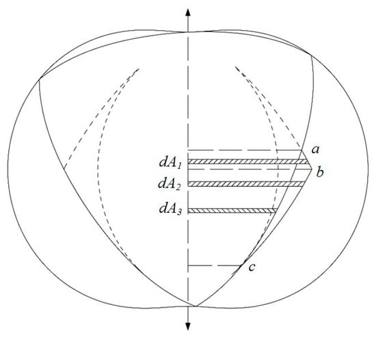 In two-stroke reciprocating engines, scavenging and exhaust ports are basically placed on side wall of the cylinder. By this way, the movement of the piston simply controls the flow in and out of the combustion chamber. With respect to top dead center, opening and closing timings of these ports are symmetrical during the cycle of its geometrical nature. The areas of these ports are functions of opening–closing time and their height. Similar to conventional reciprocating two-stroke engine, piston (rotor) flank edge-controlled ports on side wall of rotary engine are used in this study. Curves that form port geometries are derived from the rotor flank geometry. The open part of the port is calculated by difference of integrated areas (Equation (7)), shown in Figure 4 as shaded.