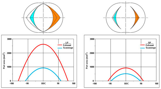 Port timings of charge and discharge of the gasses have a key role for the performance of two-stroke engines. Two types of typical port timings for a two-stroke engine controlled by piston movement are selected from Blair [26] and given in Table 2. These types of port timing events are symmetrical, which means the closing times of exhaust and scavenge ports are identical to their opening times (Figure 5). Since two-stroke of reciprocating engine equals 360° crank angle and the equivalent of this for a Wankel engine is 540° eccentric shaft angle, the values of timings from reciprocating engines are converted to Wankel geometry by multiplying 3/2, as shown in Table 2. Due to the Wankel geometry, these timings also define the surface area of ports, where this is a function of arc length of ports at cylinder surface in the case of reciprocating engine. Early opening and late closing ports are called “Large Ports” and abbreviated with LP. Conversely, late opening early closing ports are called “Small Ports” and abbreviated with SP (Figure 5).