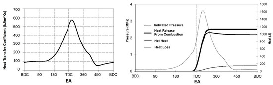Fuel quantity (gasoline) in the combustion chamber is calculated according to the amount of fresh charge. Model calculations are made for stoichiometric mixture. Combustion process, i.e., heat release, is calculated according to the Vibe function and applied as a single-zone model [33]. Combustion efficiency is assumed to be 95% for whole working conditions; hence, heat release is also calculated with this assumption. Figure 6 shows an example of heat transfer coefficient, heat release, and loss in the combustion chamber.