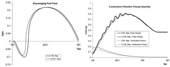 Effect of time step on scavenging port flow and combustion chamber charge quantity (2.5 bar charge pressure, 4000 rpm).