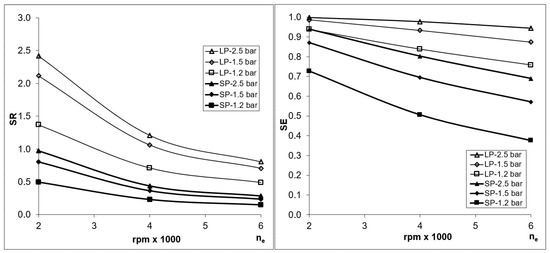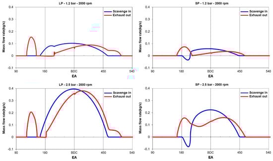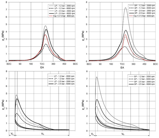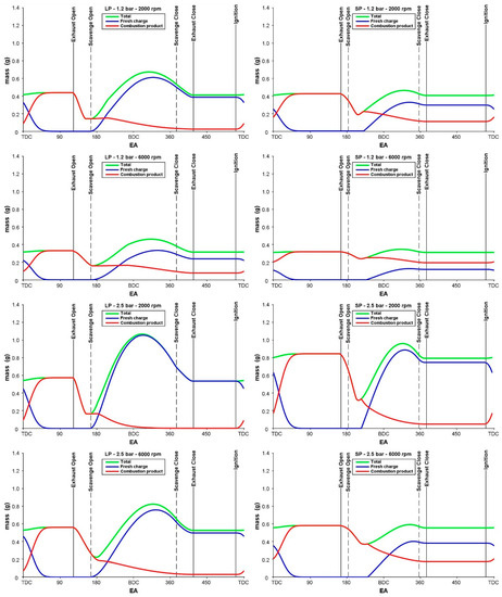In Table 3, the main geometry and working conditions of the model engine are summarized. There are two different types of port geometries (large port—LP; small port—SP) [26], three different charging pressures (1.2 bar, 1.5 bar, and 2.5 bar), and three speeds (2000, 4000, and 6000), hence 18 conditions are calculated. Combustion parameters (rate and duration) are taken from experimental data in the previous four-stroke Wankel engine literature [34,35,36].