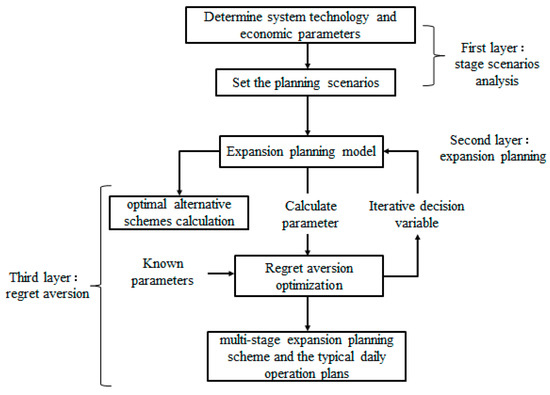 Based on the structure and energy flow of the IPIES, the expansion planning method of the IPIES considering regret aversion proposed in this paper is shown in Figure 2. It includes three layers: The stage scenario analysis layer, the expansion planning layer, and the regret aversion layer.