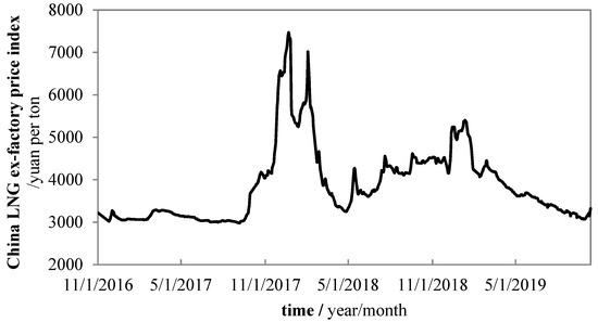 The electricity market is still not perfect in China, but electricity prices are relatively stable due to policy decisions; natural gas prices, however, will be affected by changes in global trade prices and domestic supply and demand factors, and there will be greater uncertainty in prices over time and space. In the past, natural gas was originally developed as a replacement for traditional fuel, and its pricing was linked to other energy such as oil and the oil-indexed gas imports in China accounted for the majority [39,40,41]. However, with the changes in the international natural gas supply and demand pattern and the continuous reform of China oil and gas market, natural gas, especially liquefied natural gas (LNG), is gradually becoming an independent energy product. In 2018, China LNG imports accounted for 60% of total natural gas imports [42]. LNG breaks the restrictions on natural gas transmission and trade between regions, greatly enhancing the transmission and impact range of natural gas prices. The 2019 Wholesale Gas Price Survey shows that Henry-Hub priced US LNG exports continued rising and there is more gas price convergence amongst countries since the global gas market and market-related pricing [43]. Figure 3 shows the China LNG ex-factory price index given by the Shanghai Petroleum and Natural Gas Exchange, reflecting the price trend of LNG in the domestic market [42]. The Shanghai Petroleum and Natural Gas Exchange, which was officially launched in 2015, opened the situation that China natural gas prices are determined by competition between supply and demand. It can be seen from Figure 3 that China’s LNG spot price also has large fluctuations in different periods.