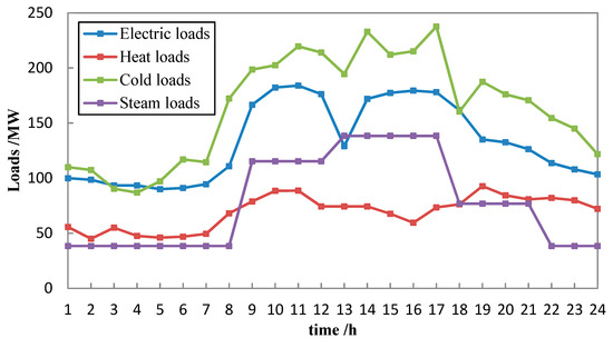 Typical daily electricity, steam, cold, and heat load curves.