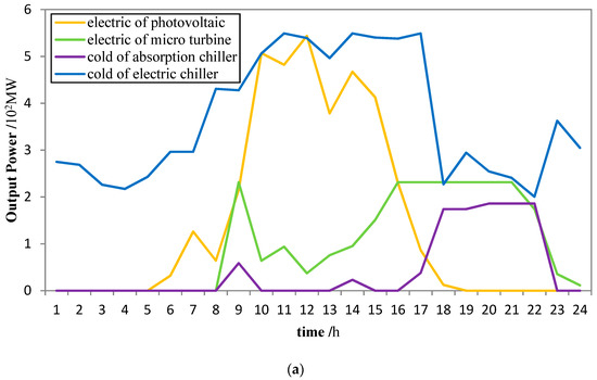 The absorption capacity of the AC and HC in the IPIES is matched with the CHP. It can be seen from Figure 7a that, in the normal output power of the PV, the CHP reduces the output power to make full use of the renewable energy, and the cooling power in the system is mainly provided by the EC. As the PV output power decreases after 14:00, the output power of the CHP increases, and the output cooling power of the AC increases. When entering the electricity price valley at 22:00, the system energy supply turns to the grid and the output power of the EC rises again. In the case of unexpected failure of the photovoltaic unit, the daily load needs to be supplemented by the CHP. At the same time, the output of the EC will rise when the electricity price valley is between 11:00 and 13:00, and the output of the CHP and the AC will decrease.