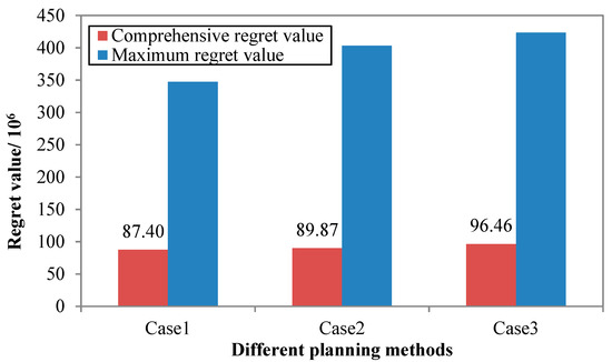 The regret value of the schemes obtained by different planning methods is shown in Figure 8. The typical device expansion planning of each scheme is shown in Table 8. The regret values under multiple scenarios with different planning methods are shown in Table 9.