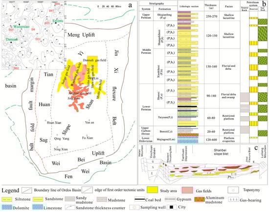 The Ordos Basin is an inherited craton basin located in the north of the northern China platform with an area of 25 × 104 km2. The regional structure appears as a gently western-dipping monocline, which can be divided into six first-order structural units including the Yimeng uplift, the Weibei uplift, the western margin thrust belts, the Shanbei slope, the Tianhuan depression, and the Jinxi flexure belts (Figure 1a) [53,54]. The Upper Paleozoic Permian Shanxi and Lower Shihezi formations are the major gas-bearing layers in the Ordos basin. The transitional facies of barrier coast system and deltaic and fluvial strata constitute a complete source-reservoir-cap assemblage, the coal strata and thick mudstone in the lower part of Shanxi formation act as regional source rock, the deltaic and fluvial sediments are the main reservoir bodies, and the regional continental mudstone deposited in the Upper Shihezi and Shiqianfeng formations forms the regional cap of the whole petroleum system (Figure 1b) [55,56,57].