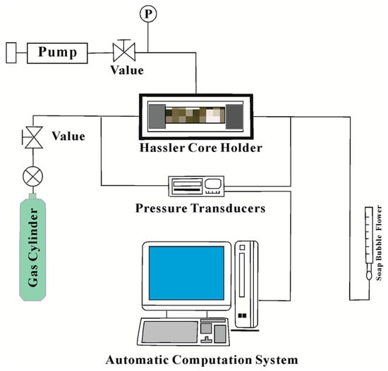The core plugs were firstly evacuated and saturated with formation water with a salinity of 50 g/L. The brine-saturated core plugs were placed into the core holder with experimental temperature and confining pressure setting to 85 °C and 22 MPa, respectively, which are consistent with formation pressure and temperature. Nitrogen was employed in the experiment for its similar physical properties compared to natural gas, with a density of 1.16 g/cm3 and viscosity of 17.54 µPa·s. The pressure transient method was used in the simulation experiments. The inlet pressure was gradually increased and kept constant for a period of time in the beginning stage, and was maintained until a stable velocity of gas flow was detected in the outlet. The pressure differences and stable velocities were recorded, and the accuracies of the injection pressure and fluid flow velocity were 0.001 MPa and 0.001 mL/min, respectively, with errors of ±1%, which were determined by the pressure transducer and flow meter of the flooding instrument. With increasing injection pressure, 10–15 data points were recorded accordingly. The experiment was not stopped until there was no longer water producing in the outlet and the flow velocities of inlet and outlet were equal.