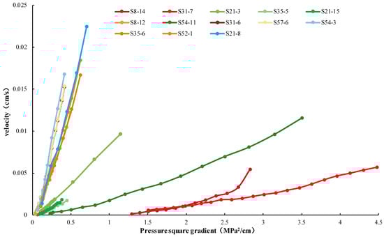 where v is the gas flow velocity, cm/s; Δ P L is the pressure square gradient, MPa/cm; K is the nitrogen permeability, cm2; μ is the viscosity, mPa·s; and a, b, c, and d are constants.