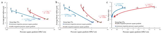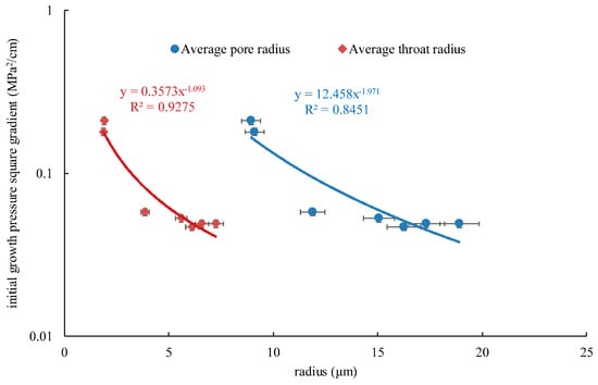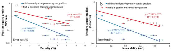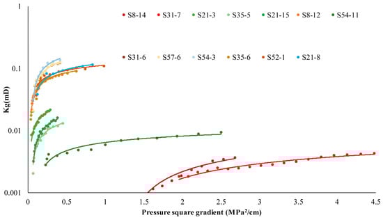 With increasing displacement pressure, the gas apparent permeability will vary regularly as the gas migrates into smaller pores by overcoming the corresponding capillary pressure, reflecting the gas flow state in migration. The variations of apparent permeability in the gas flow process can be divided into two segments, in which the gas apparent permeability increases steadily in the beginning stage and then becomes stable in the later stage with the continuously increasing pressure square gradient. According to the analysis of 13 samples (Figure 5), the apparent permeability had a strictly logarithmic correlation with the pressure square gradient in the semi-log coordinate. This correlation can be described by a general fitting equation (Equation (8)) according to the numerical fitting (Table 2). Accordingly, the positive real roots of the fitting equation if the apparent permeability was assumed to be zero were defined as the minimum migration pressure square gradients, representing the minimum driving forces required to start the gas migration in water-saturated tight sandstone reservoirs. The stable gas apparent permeability in the later stage indicated the formation of a main pathway for gas flow in the pore system and corresponded to a secondary large-scale gas migration in the formation scale. Therefore, we defined the minimum pressure square gradient that had a difference of 5% or less with the stable apparent permeability as the stable migration pressure square gradient. The two migration pressure square gradients had errors of ±1%, which were determined by the experiment instruments.