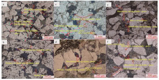 Figure 7. Typical pore types observed by casting thin section observation. Primary and dissolution intergranular pores dominated the plane-viewed porosity in the tight sandstone samples of S52-1 (a) and S57-6 (b). Plane-viewed porosity was dominated by the dissolution intergranular pores, followed by a little amount of dissolution intragranular and intercrystalline pores in the samples of S8-12 (c) and S35-6 (d). Evident porosity loss occurred in the sample of S8-14 (e) and S31-7 (f) due to compaction and cementation, the intergranular pores decreased sharply, and dissolution intragranular and intercrystalline pores had higher porosity contributions in pore system (the interpretation is given by red arrows and yellow annotations in the figure).