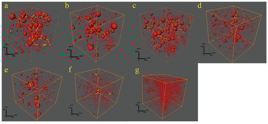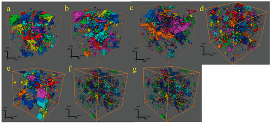 Figure 8. The 3D pore spatial distribution images of seven tight sandstone samples obtained by grayscale segmentation: (a) S52-1, (b) S57-6, (c) S8-12, (d) S54-11, (e) S35-6, (f) S31-7, and (g) S8-14 (the irregular bodies in 3D are the pores in the rocks, which are separated by different color labels in the pore system. Same color labels indicate connected pores in adjacent areas).