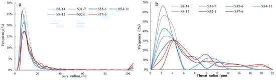 Figure 9. The pore size distributions (a) and the throat size distributions (b) of the seven chosen samples obtained from pore network modeling.