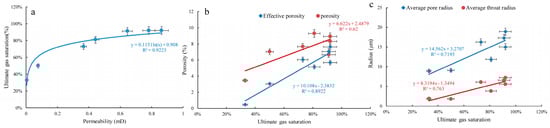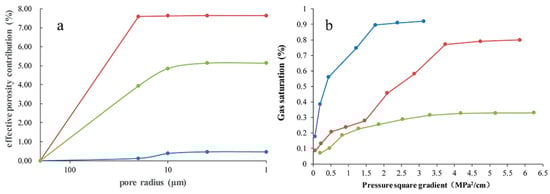 A high consistence has been revealed when comparing the effective porosity cumulative curve (Figure 15a) with the gas saturation growth curve of the same sample (Figure 15b). In the meso-small pore dominant reservoirs of S8-14, the cumulative curve of effective porosity contribution from macropores to micropores experienced a slow growth stage before it became stable (blue line in Figure 15a) and was consistent with its slow gas saturation growth pattern (green line in Figure 15b). Low porosity contribution of macropores and high contributions of mesopores and small pores would result in reductions in pore and throat radii and further lead to a greater increase of pressure square gradient required for a same incremental saturation growth, and a slower saturation growth rate. In the full-pore reservoir of S54-11, the cumulative curve experienced a rapid-slow growth pattern before it became stable (green line in Figure 15a), which was consistent with the gas saturation growth pattern (red line in Figure 15b). As the macropores, mesopores, and small pores played important roles in porosity, the gas saturation experienced a rapid growth period in the beginning stage as gas firstly migrated into macropores and mesopores and then slow down due to the capillary pressure increase caused by small pores and micropores. The small pores and micropores resulted in a larger pressure square gradient required for the same incremental saturation growth in the later stage. For the macropore-dominant reservoir of S52-1, the cumulative curve of effective porosity contribution experienced a rapid linear growth pattern (red line in Figure 15a). The same growth pattern was also found in the saturation growth curve (blue line in Figure 15b). As the dominant macropore porosity evidently decreased the incremental driving force required for the same incremental gas saturation growth, the gas saturation exhibited a rapid growth rate compared with the other two types of reservoirs. The differences in the effective porosity contributions of different pore types controlled the variations in the gas growth patterns of the tight sandstone reservoirs (Figure 15). It can be further inferred that the cumulative curves of effective porosity contributions from macropores to micropores can be employed to predict the ideal gas growth models in the tight sandstone reservoirs.