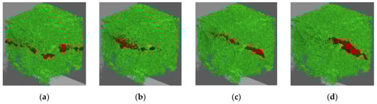 For the conditions of the micro-fractures with and without roughness respectively, digital cores with a micro-fracture with the dip angle of 10°, 20°, 30° or 40° while maintaining an aperture of 10 μm are built, as shown in Figure 9. Each of the fractures is a plane at an angle to the XY plane, and penetrates in the Y direction. Pore-network models with corresponding dip angles are shown in Figure 10.