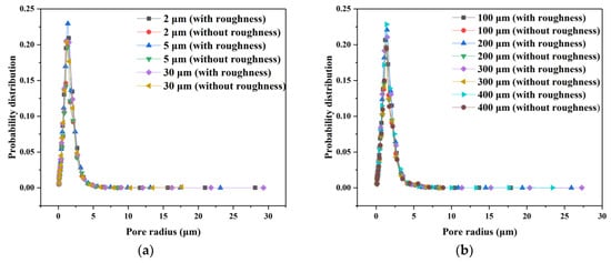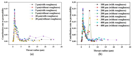 In addition, it is shown that the distribution of pore-throat radius is larger for pore-network models with roughness compared to those without roughness. The presence of coarse particles makes pore-throat structures more diverse, which can also be seen visually from the constructed pore-network models. For models with roughness, the contribution of the pore-throat radius to permeability has larger distribution in the region where the pore and throat radii are small.