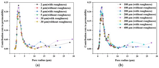 Contribution rate of pore radius to permeability with different fracture apertures (a) and lengths (b).