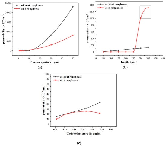 The resistance of fluid increases due to retention and drag effects on the fluid of a rough fracture surface, leading to lower absolute permeability. The absolute permeability is also an exponential function of the fracture aperture but with a smaller growth factor compared to the surface without roughness. In addition, the absolute permeability is still linearly correlated with the fracture length when the length is small. Then the absolute permeability suddenly increases when the fracture length reaches 300 μm. Finally, the absolute permeability is no longer linearly positively correlated with the cosine of the fracture dip angle, as shown in Figure 15c. Therefore, only the influence of the micro-fracture aperture on the single-phase flow stays similar for surfaces with and without roughness.