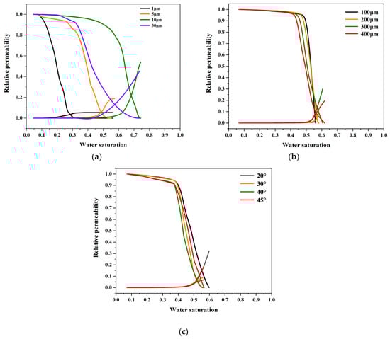 Relative permeability curves with different fracture apertures (a), lengths (b) and dip angles (c).